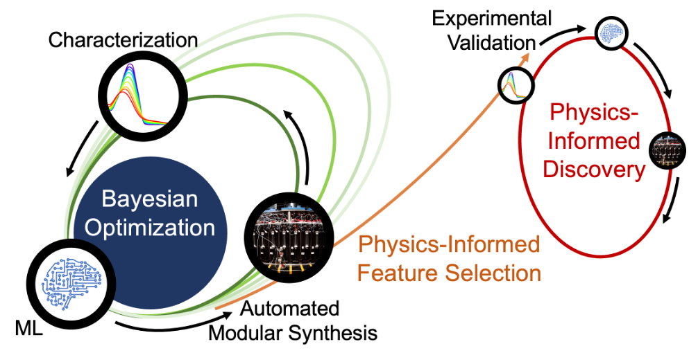 A crucial challenge for soft materials design is the strong coupling of disparate length and timescales that mediates materials behavior; molecular degradation is influenced by temperature and humidity; electronic and ionic transport are controlled by mesoscale morphology; biological functionality is inherently hierarchical. This confluence of length and time scales requires the integration of a collection of theoretical, computational, and data-centric techniques to fully characterize material performance. In the past decade, machine-learning (ML) approaches to molecular modeling have transformed the landscape of materials research and engineering. Our research goal is to develop automated and synthetically-aware machine learning models that transform experimental design and closed-loop discovery efforts for soft materials. Specific directions in the group include: (i) generative machine learning models of polymers incorporating synthetic awareness (collaboration with IBM), (ii) closed-loop Bayesian optimization of organic materials (collaboration with Molecule Maker Laboratory Institute), (iii) the design of photoactive polymer resins for 3D printing (collaboration with UT-Austin).