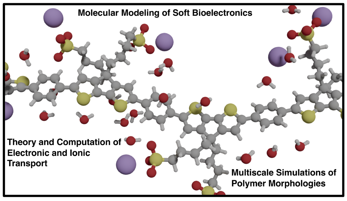 Semiconducting molecules and polymers combine the mechanical and thermophysical advantages of soft materials with optoelectronic functionality common to inorganic semiconductors (e.g. Silicon, GaAs). In recent years, the application of these materials classes in biological systems as signal transducers at neural interfaces has emerged. To design materials for these systems requires the challenging multiscale prediction of morphological structure, electronic conductivity, and ionic conductivity. Our research goal is to develop computational models capable of efficiently describing the strong coupling between electronic, ionic, and mesoscopic degrees of freedom in organic materials and to use these models to understand the fundamental tradeoffs between electronic and ionic conductivity in polymeric materials.